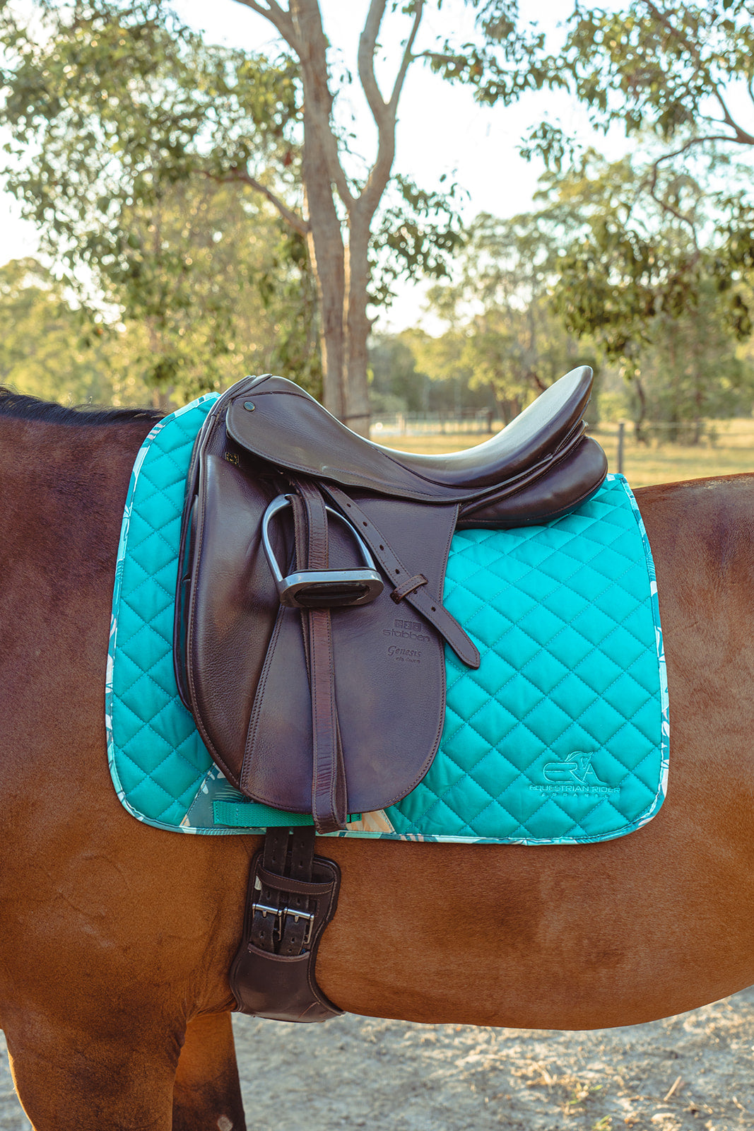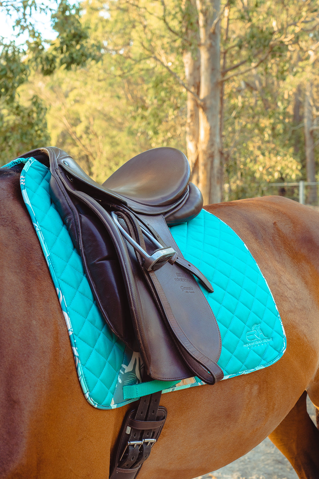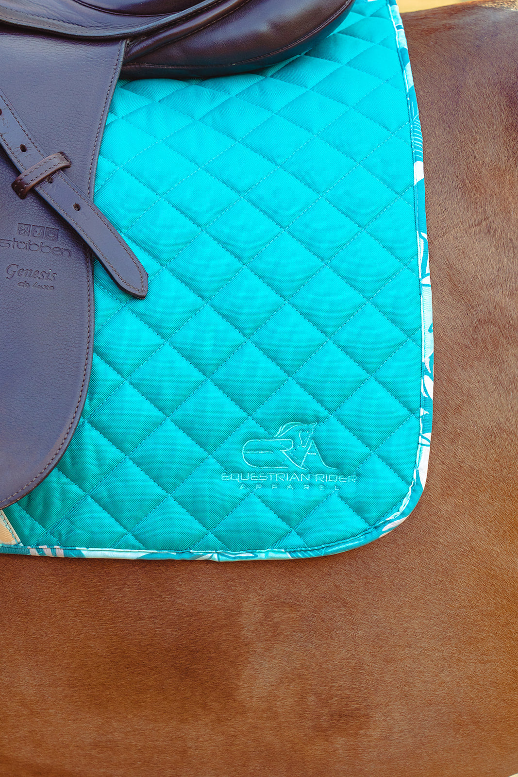 Finish off your outfit with our teal cotton Dressage Cut saddle pad with salty spur print edging.